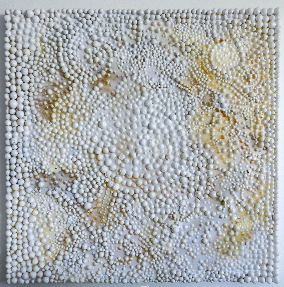 2018-23, pured and hand-cast resin, mixed media and polymer clay on wood panel, 60 x 60 x 3 inches